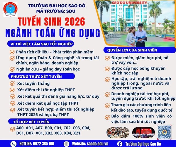 Song hành cùng đó, ngành Toán ứng dụng chính là "chìa khóa" để bạn làm chủ kỷ nguyên 4.0. Không còn là những con số khô khan, bạn sẽ học cách biến dữ liệu thành sức mạnh trong phân tích tài chính, kinh tế và công nghệ. Với phương châm "Học đi đôi với hành", Đại học Sao Đỏ cam kết tạo ra môi trường trải nghiệm thực tế tối đa, kết nối chặt chẽ với mạng lưới doanh nghiệp để mở rộng cánh cửa việc làm ngay sau khi tốt nghiệp.