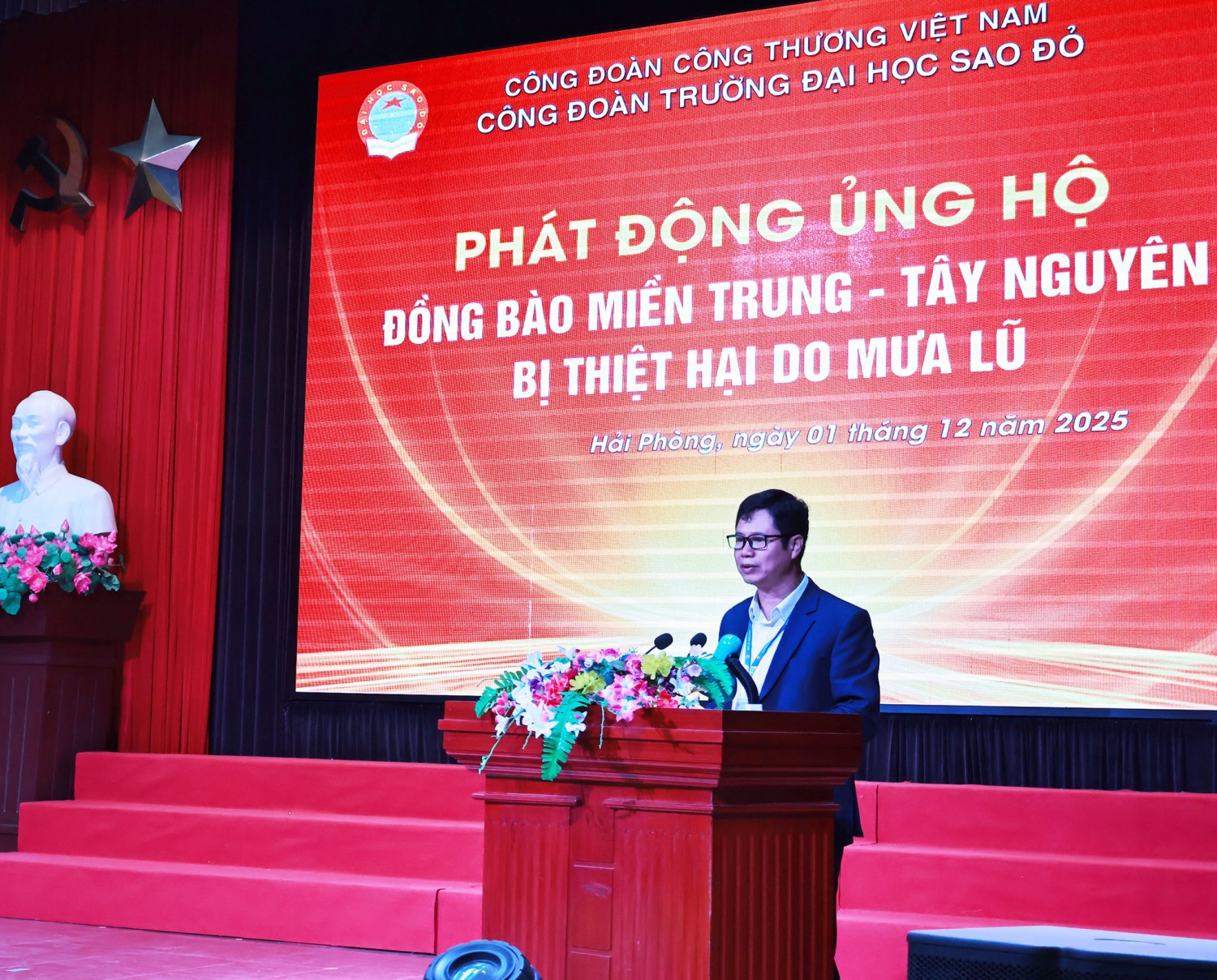 Phát truyền thống của người Việt Nam tính dân tộc nghĩa đồng bào với tinh thần đoàn kết “tương thân tương ái”, “lá lành đùm lá rách”, sáng ngày 01/12/2025, tại hội trường đa năng Trường Đại học Sao Đỏ tổ chức phát động toàn thể cán bộ, viên chức và sinh viên toàn trường chung tay ủng hộ, hỗ trợ đồng bào miền Trung - Tây Nguyên bị thiệt hại do bão lũ.